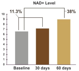 - Result: NAD+ level increases to 11.30% in 30 days and 38% in 60 days